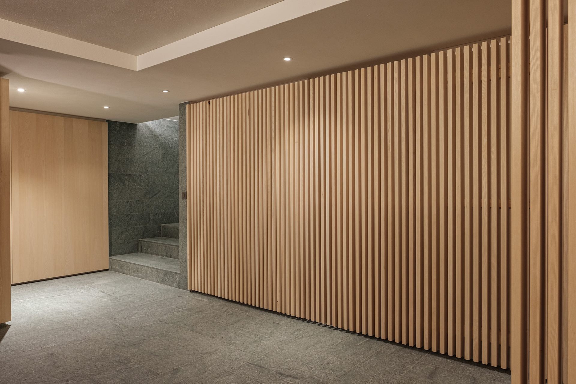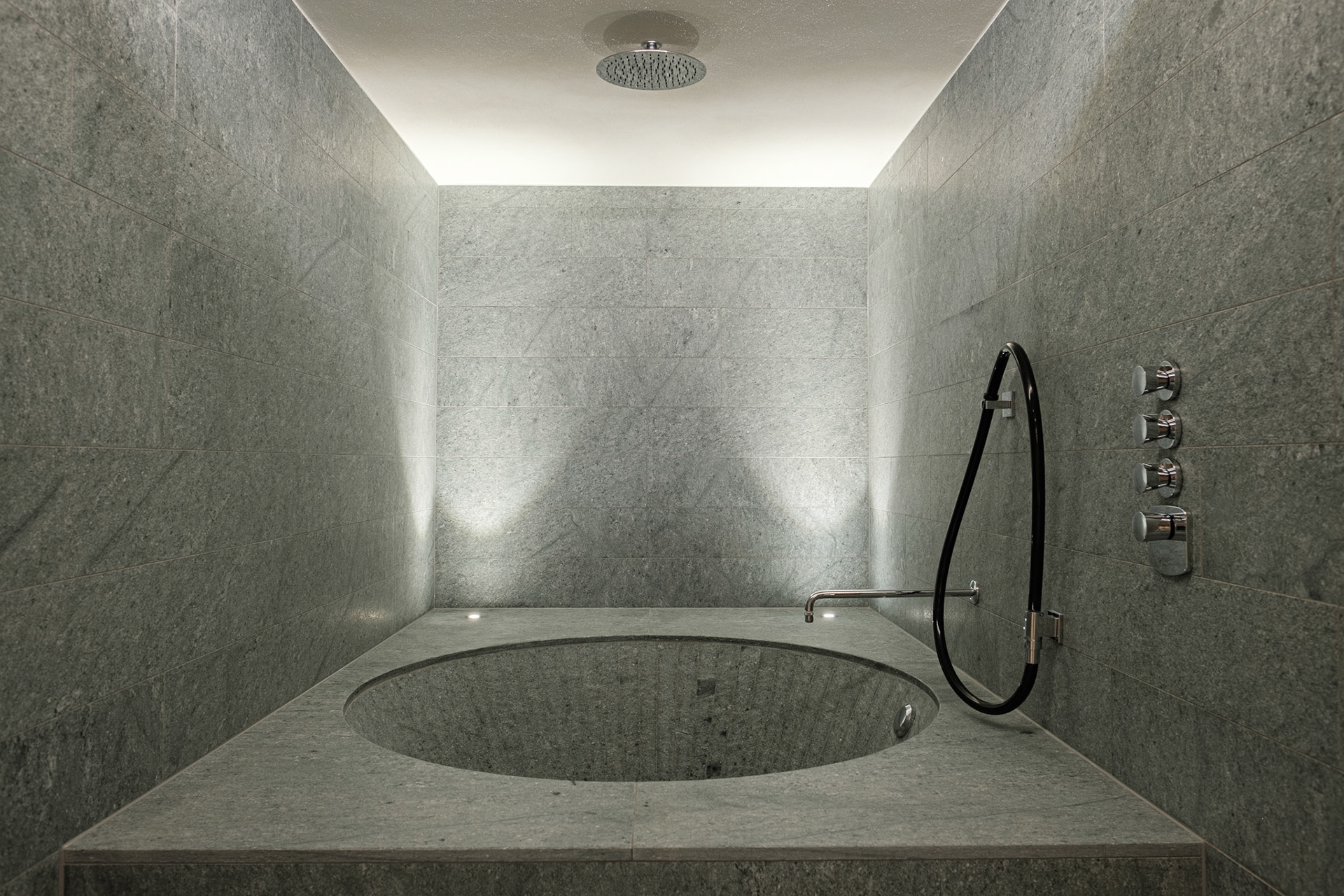 Umbau eines Kellers zu einem Wellnessraum. Naturstein aus Andeer, Granit sandgestrahlt und gebürstet. Eschenholz naturbelassen fein geschliffen. Lehmbausteine und Lehmverputz.